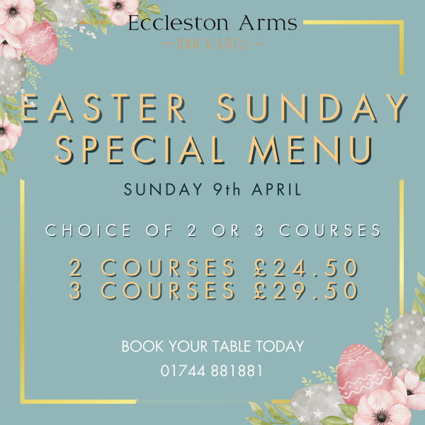 Easter Sunday Lunch Sunday 9th April, 2023 Facebook Profile Twitter Profile Instagram Profile Sunday 9th April, 2023 Easter Sunday Lunch 🐣Put all of your eggs in one basket and join us this Easter Sunday. Enjoy a fabulous 2 or 3 course menu. Our tables are already filling up quickly. Book yours today by calling us on 01744 881881. View the menu HERE